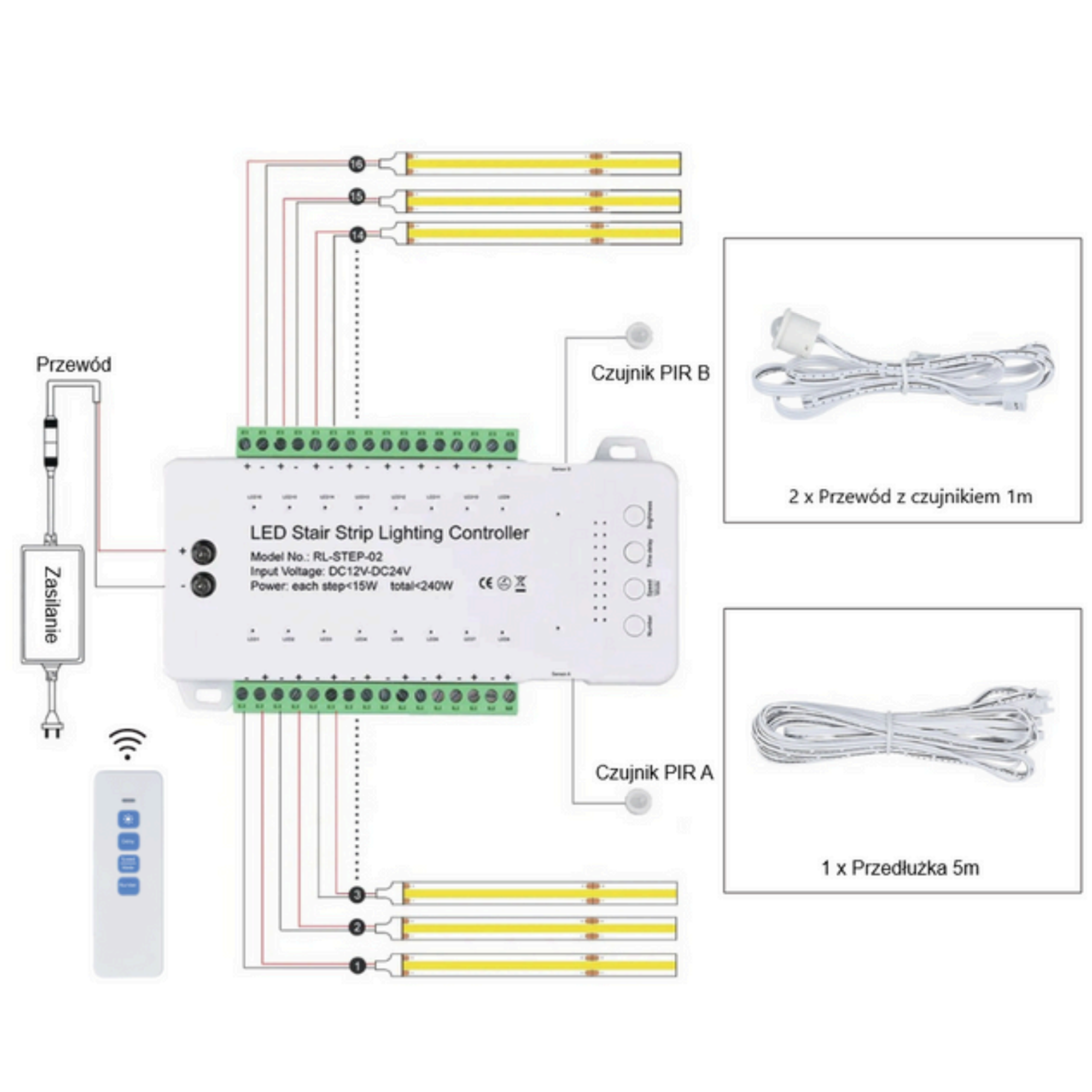 Sterownik schodowy 16-kanałowy 12V/24V max 15W/kanał regulowana jasność i prędkość + pilot