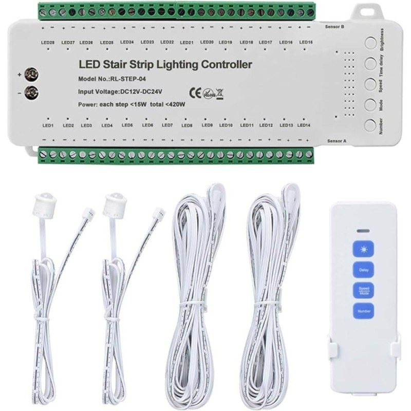 Sterownik schodowy 28-kanałowy 12V/24V max 15W/kanał regulowana jasność i prędkość + pilot